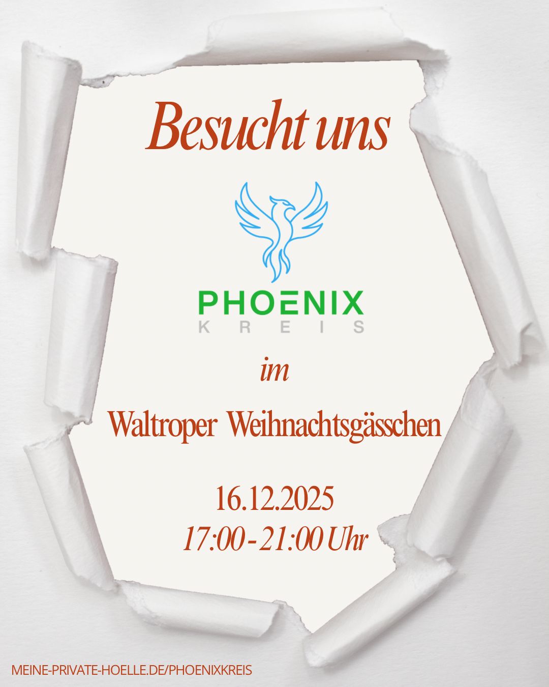 Der Phoenixkreis – eine Selbsthilfegruppe aus Waltrop – lädt Sie herzlich zur Benefizveranstaltung am 16. Dezember 2025, von 16 bis 21 Uhr, im gemütlichen Waltroper Weihnachtgässchen ein: